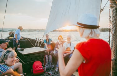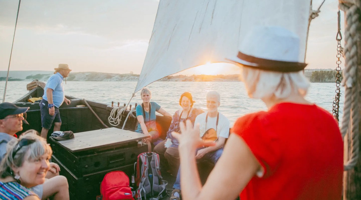 Plaukimas Kuršių mariomis Didžiosios kopos link trunka nuo 1 val iki 1 val 20 min. Pakeliui trumpai pasakojame apie kurėnus ir šio krašto istorijas. Grupėje iki 12 žmonių.